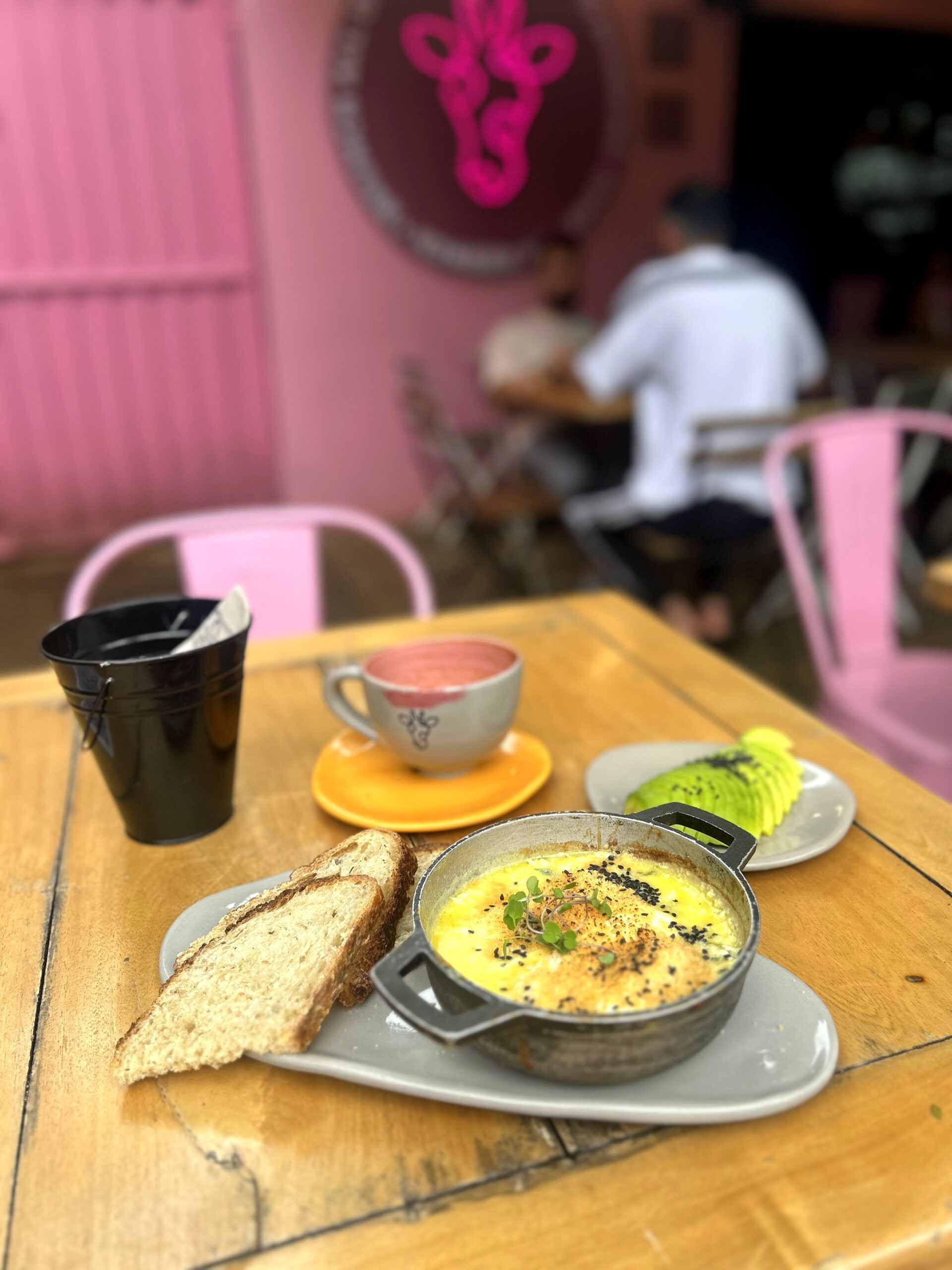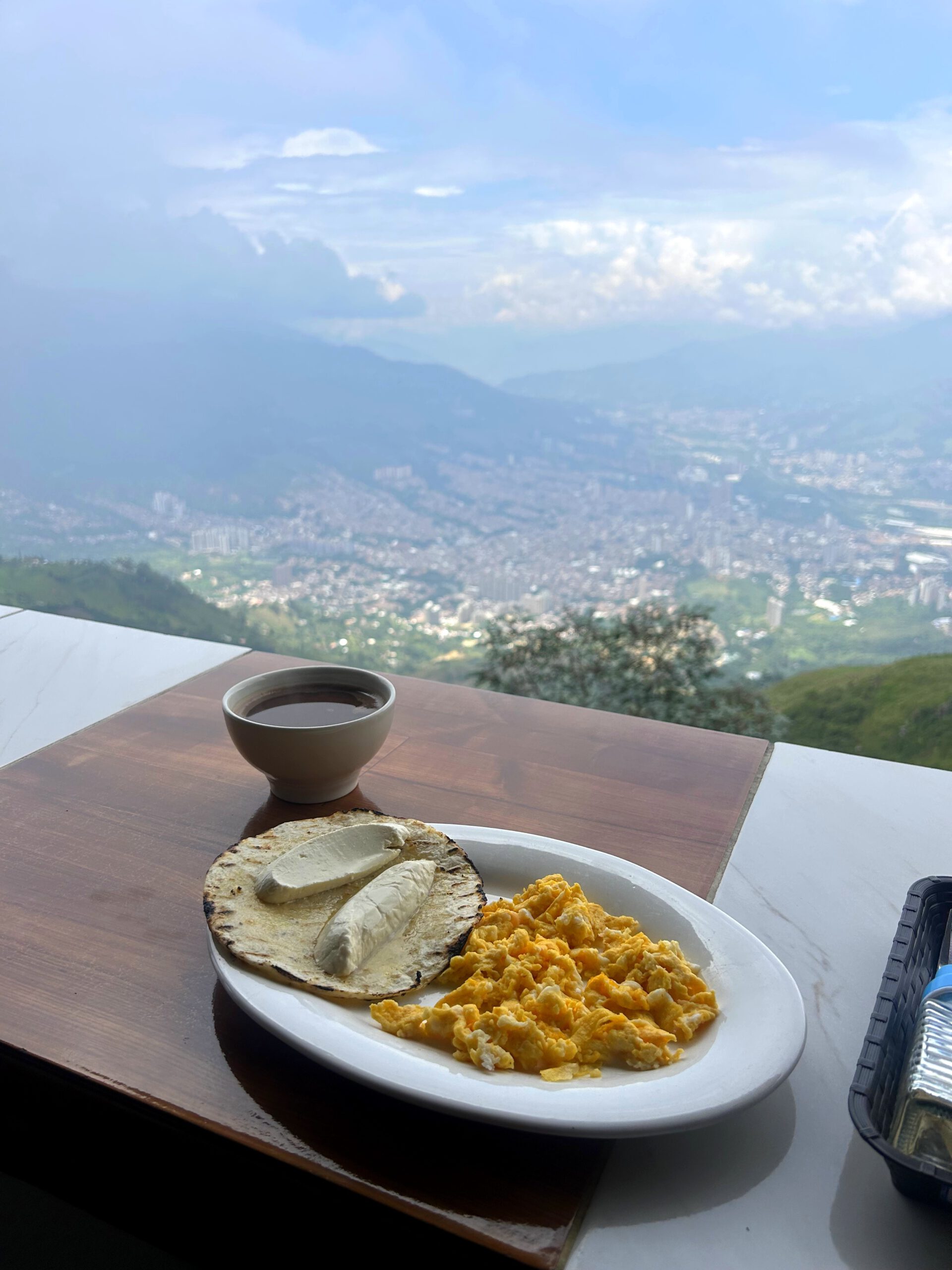 Once we reached San Félix, the view took my breath away. Floating above Medellín, with the city slowly disappearing beneath the clouds, was an unforgettable feeling. The sky was a bit misty, so the view wasn’t completely clear, but the sense of freedom made up for it. Afterwards, we had a small breakfast — eggs and hot chocolate — overlooking the valley. It was one of those quiet, grounding travel moments I truly cherish.