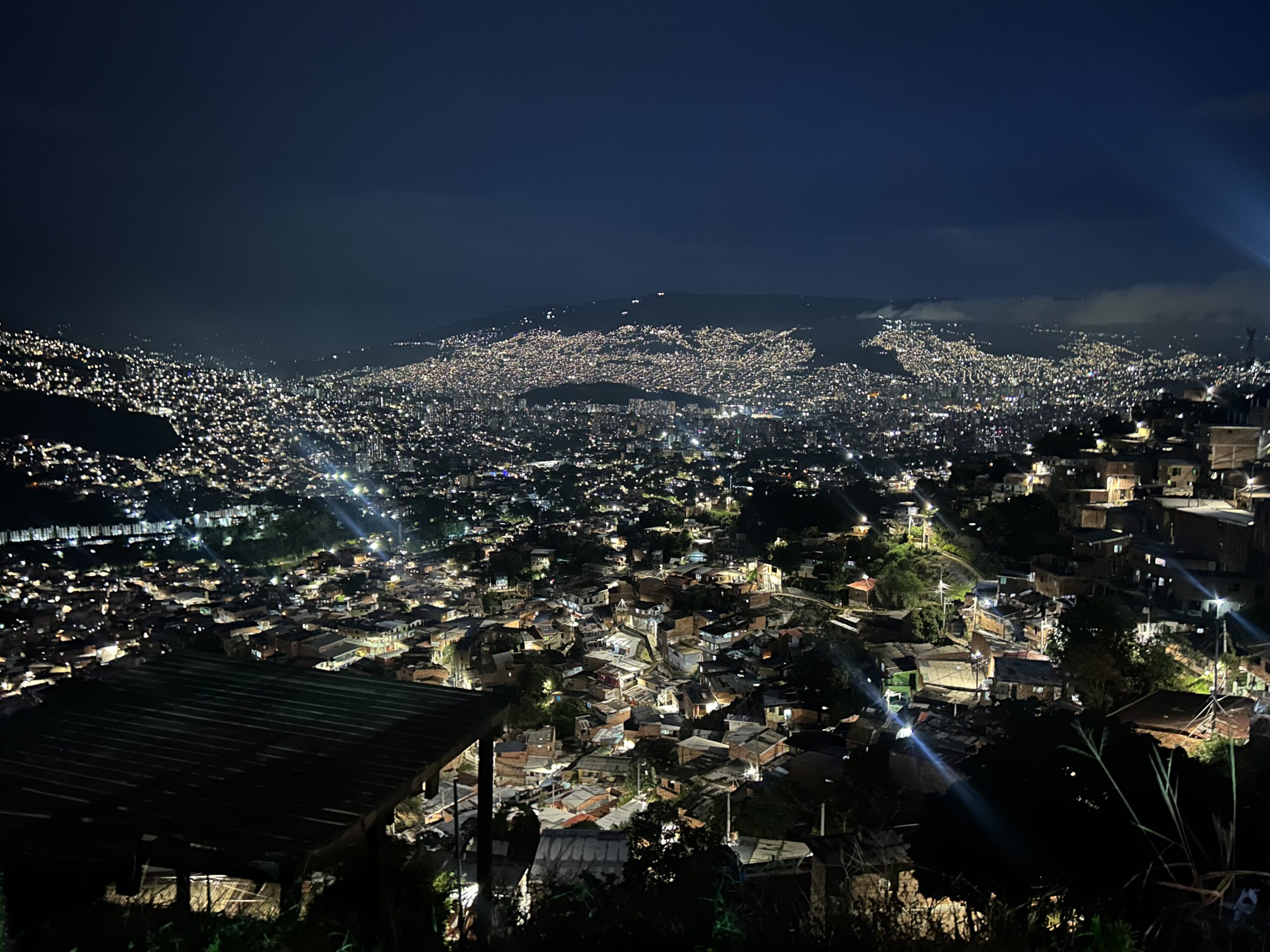Aan boord leerde ik twee Spaanse dames van de grondstaf kennen, met wie ik meteen een klik had. We deelden zelfs een taxi in Medellín — superlief, en het scheelde ook nog eens flink in de kosten. Terwijl we de stad inreden, keek ik uit over de bergen vol lichtjes. Dat uitzicht blijft magisch, net als tijdens mijn eerste reis in 2022.