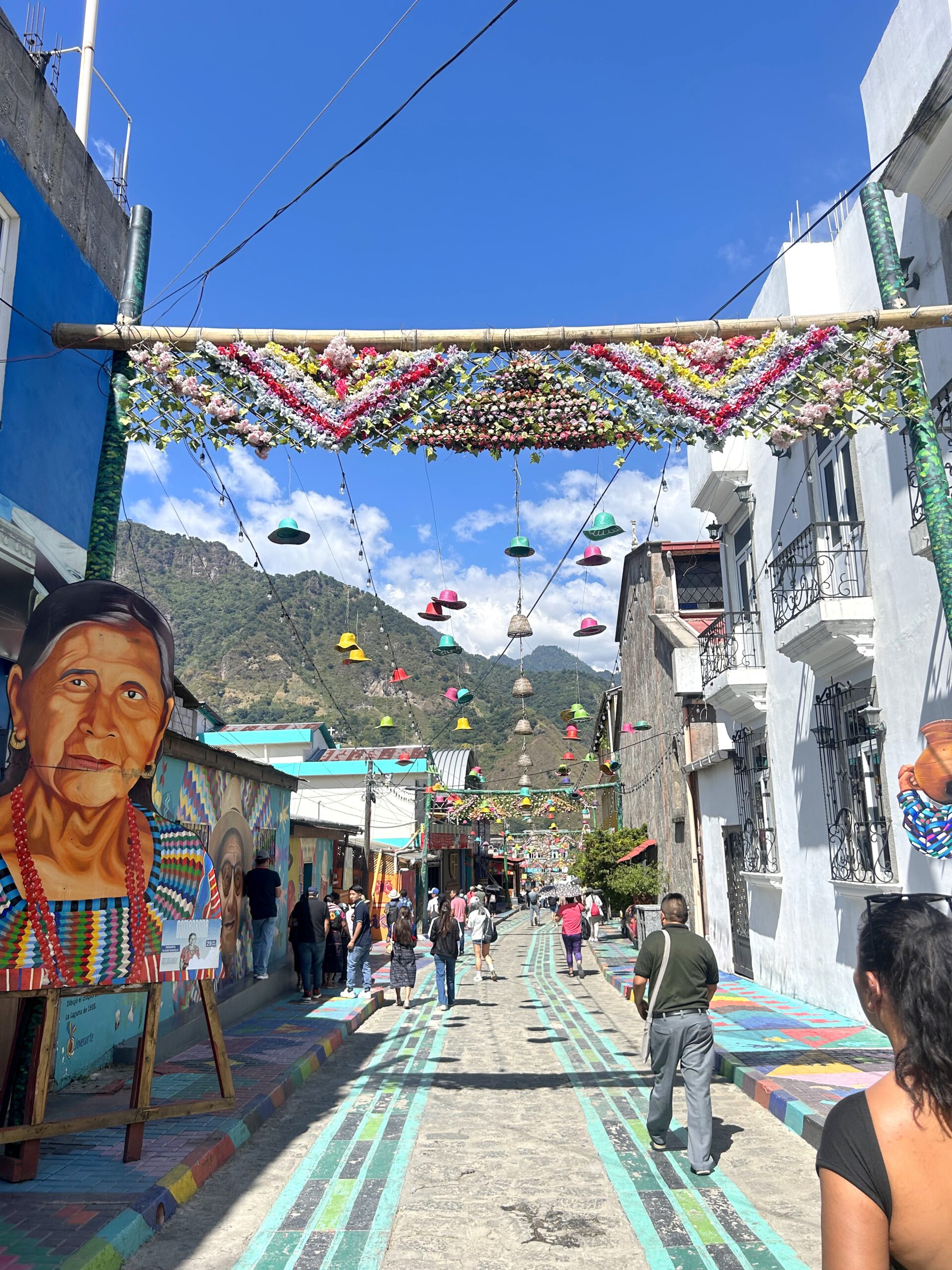 Daarna gingen we naar San Pedro, het levendigere, meer op feesten gerichte dorp aan het meer. We hebben er een klein hapje gegeten, maar eerlijk gezegd was de sfeer niet helemaal ons ding. We wilden er ook zeker van zijn dat we de boot terug haalden, want die vaart ’s avonds niet meer.