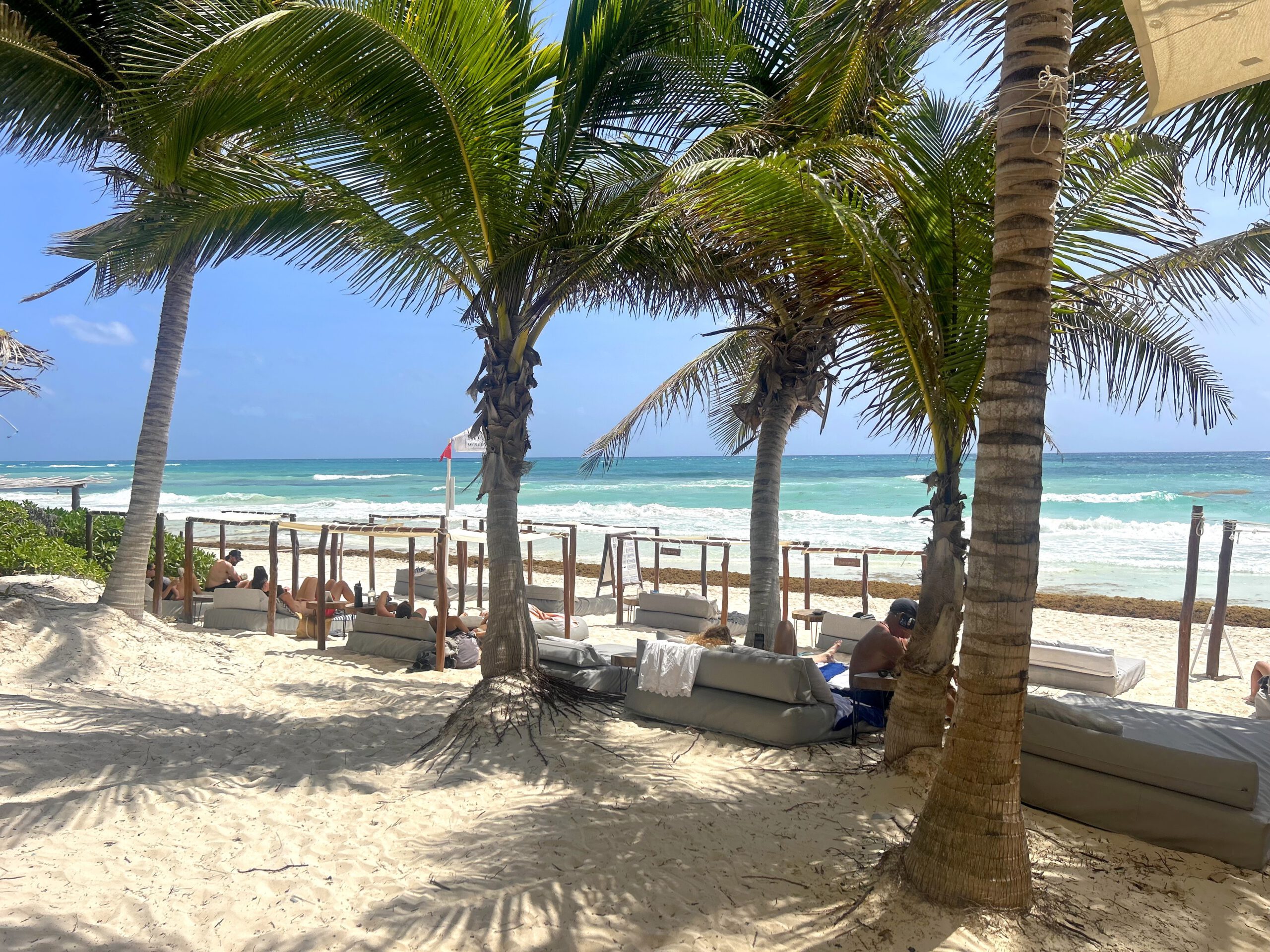 Later haalde mijn vriendin Cyni me op met haar auto en reden we naar Lula, een beachclub in de hotelzone waar je — yes — geen minimum spend nodig hebt voor een bedje. De sfeer daar is heerlijk relaxed en het heeft iets lichts, bijna Scandinavisch qua vibe. We bleven er een paar uurtjes zonnen en kletsen, en ik verkleurde meteen (zoals altijd). De rest van de middag spendeerde ik met Cyni en Leon in haar appartement. We deden wat boodschappen, haalden pakketjes op, regelden wat huishoudelijke dingen… heel casual, maar juist dat soort momenten geven me het gevoel dat ik echt een beetje local ben in Tulum.