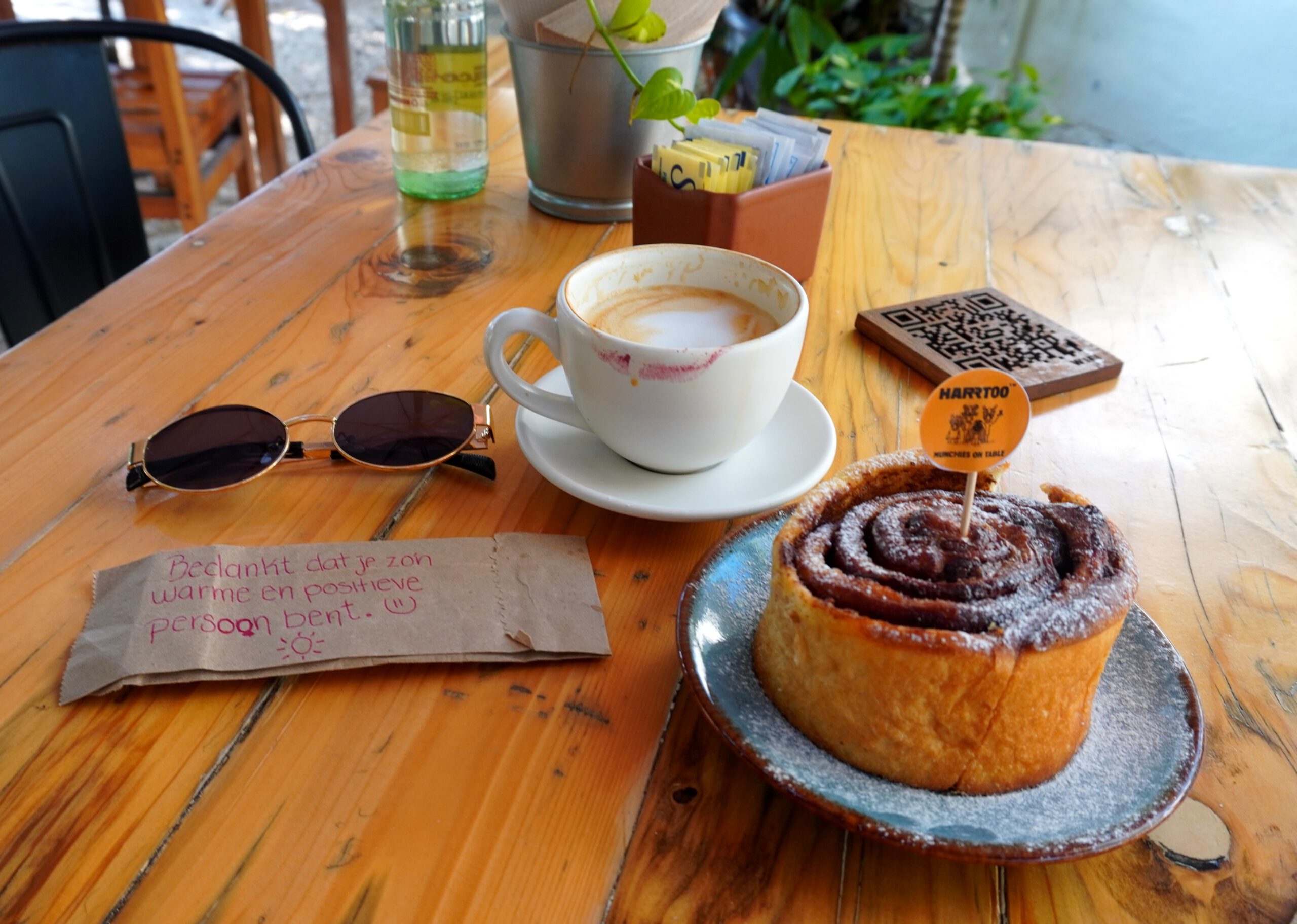 Deze keer ging ik weer naar Harttoo, omdat Yocelynn daar werkt – een ontzettend lieve Mexicaanse meid die ik in 2024 heb leren kennen. Als verrassing kreeg ik van haar een cappuccino, een súper lekkere chocolade-cinnamon roll én een brief met een armbandje. Daar moest ik stiekem echt even een traantje om laten. Zo’n brief die je bewaart, en een van de liefste gebaren die ik ooit van iemand heb gekregen.