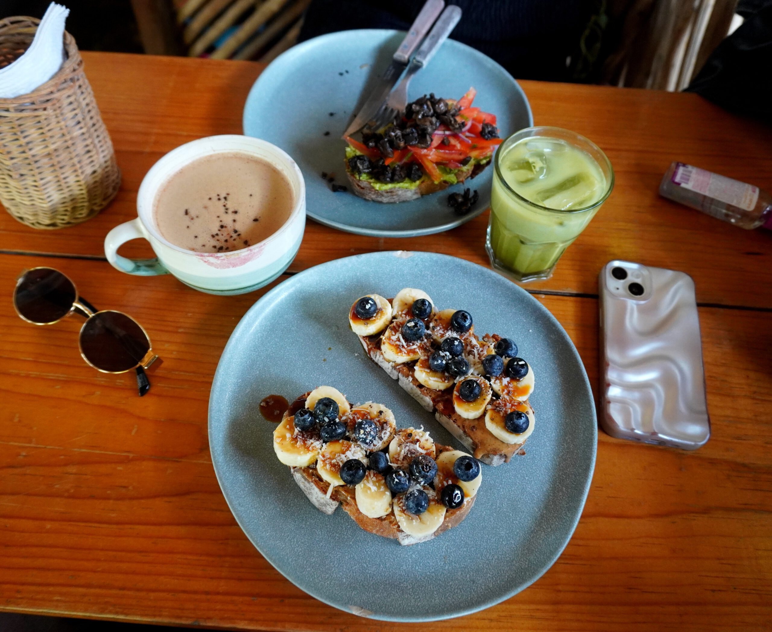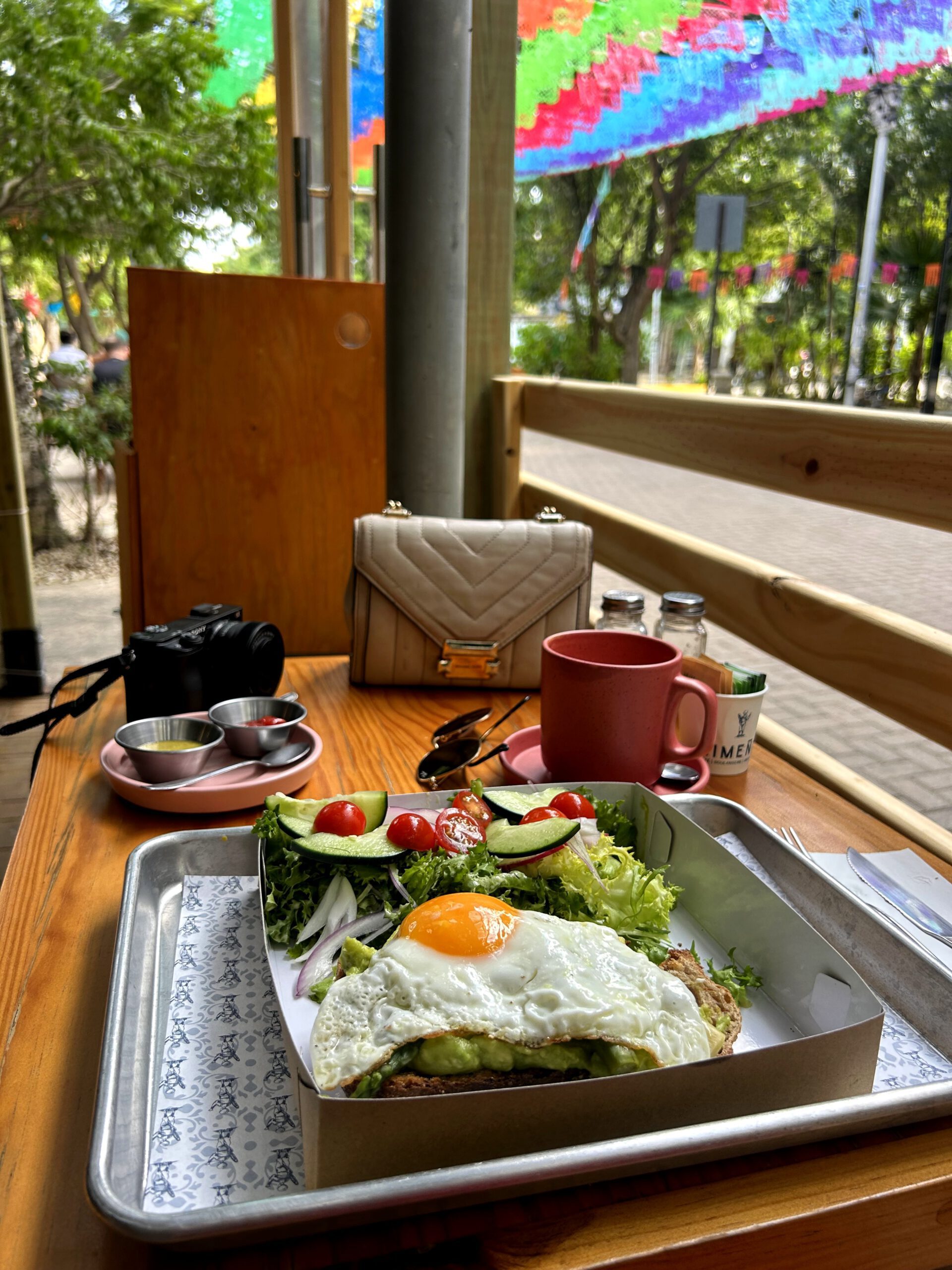 Op mijn fiets van Tulum Bike Rental (iBike Tulum – @bike.tulum) fietste ik naar Nimeño Zama. Nimeño heeft meerdere vestigingen in Tulum, dus er is gelukkig altijd eentje in de buurt. Ik bestelde de sourdough (oprecht het lekkerste zuurdesembrood dat ik ooit heb gegeten) met avocado en ei, en natuurlijk hun heerlijke cappuccino. De staff is hier ook altijd zó lief en hardwerkend. Kleine tip als je nog niet eerder in Mexico bent geweest: fooi geven is hier echt gebruikelijk, net als in de VS – minimaal 10%.