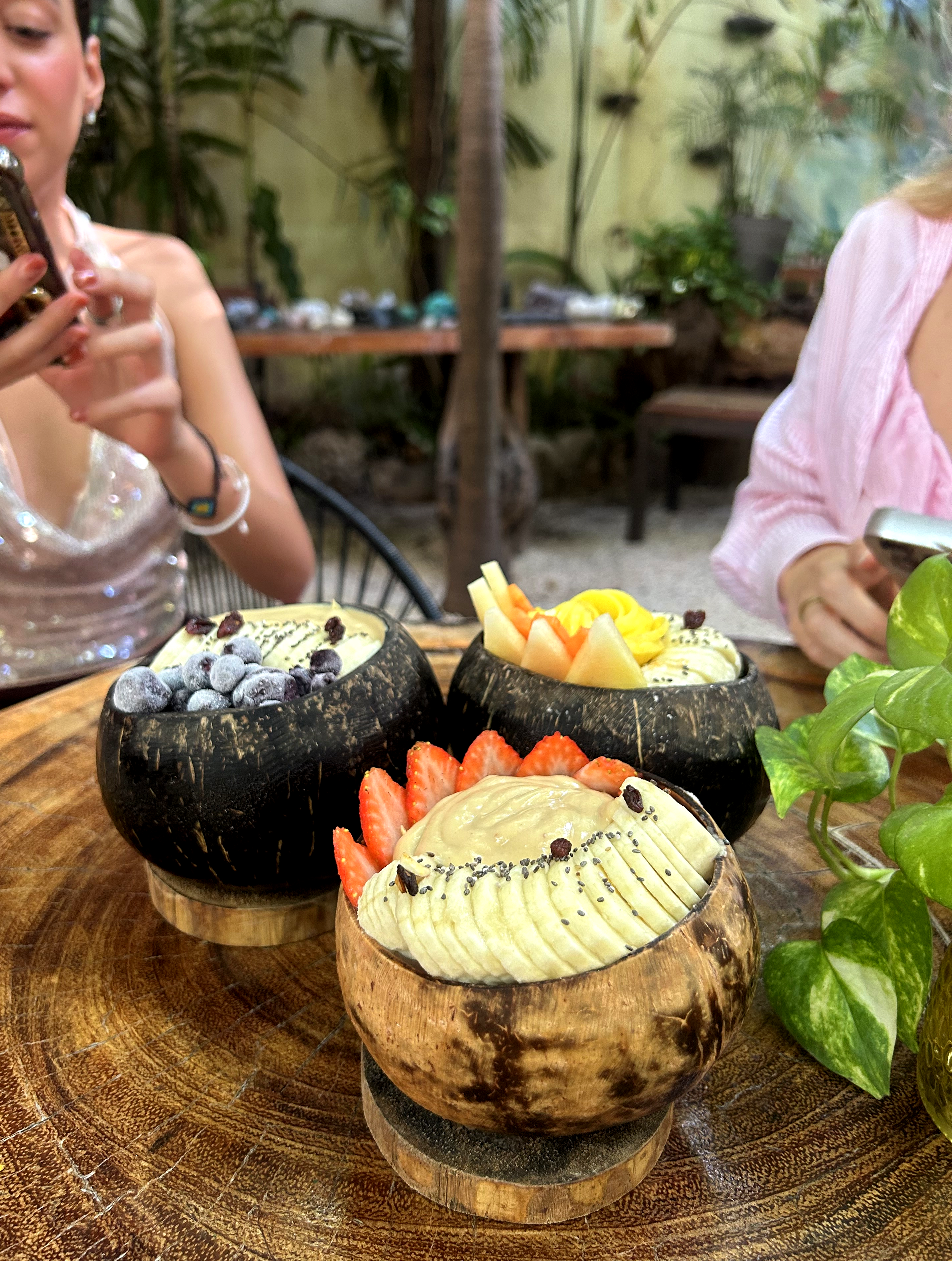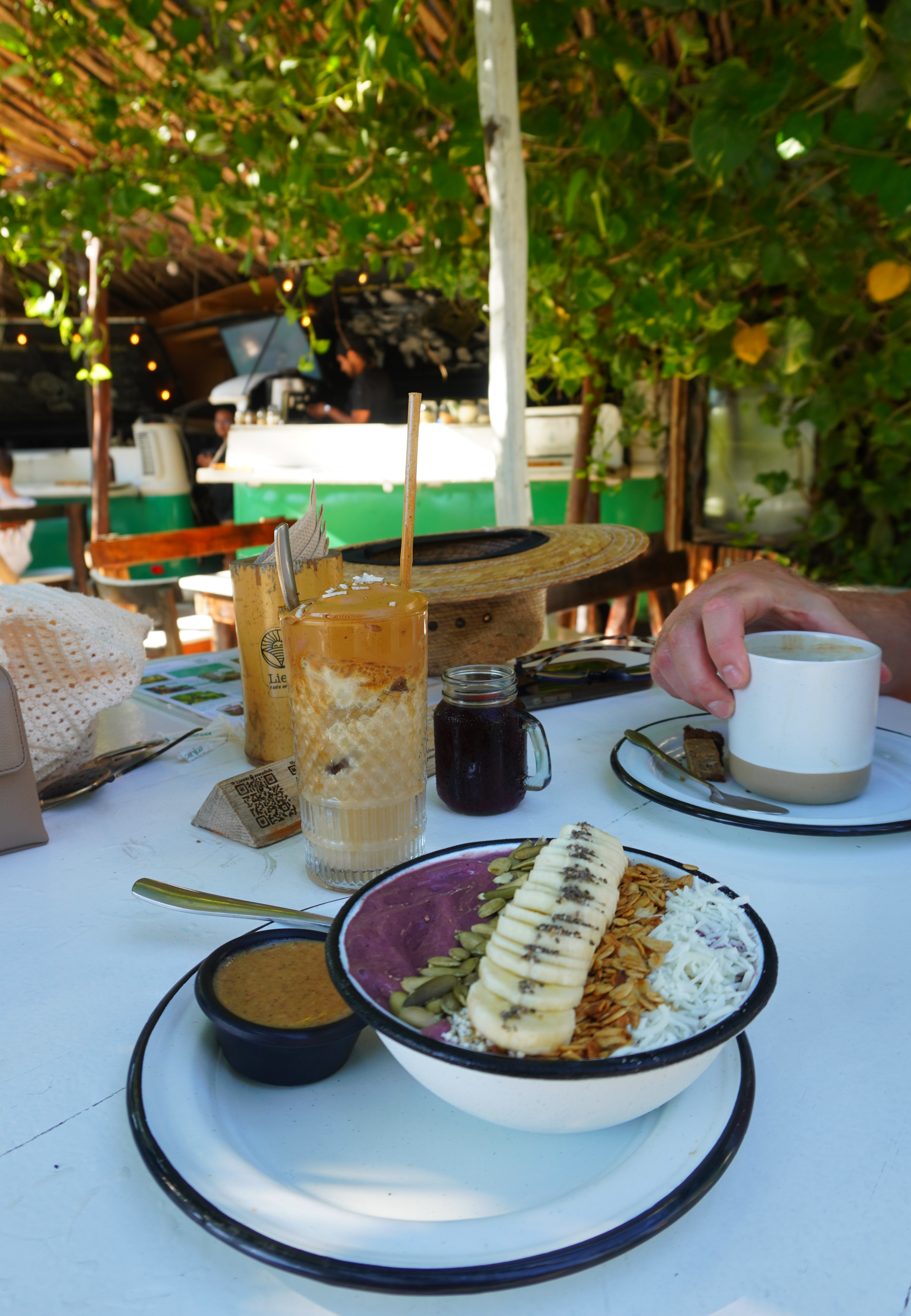 Ik sprong al snel op de fiets richting Nimeño in La Veleta, wat in mijn ogen een van de beste koffie- en lunchplekjes van heel Tulum is. Toevallig kwam ik daar een meisje tegen dat ik kende, en ze vroeg of ik even model wilde zitten voor wat content van de zaak. Als cadeautje kreeg ik mijn ontbijt van ze – super lief. Ik nam een cappuccino en een heerlijke açai bowl.