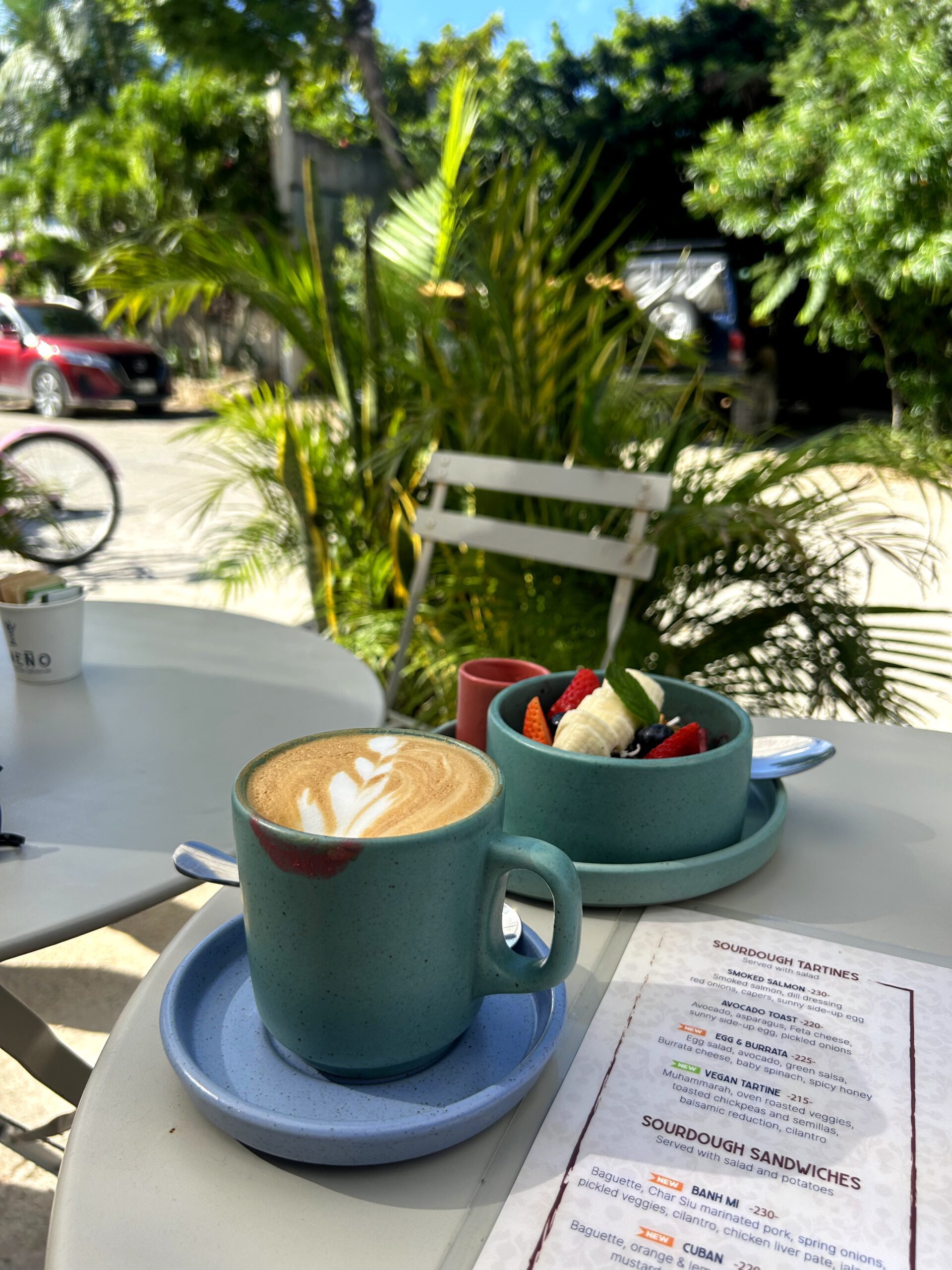 I quickly hopped on my bike and rode to Nimeño in La Veleta – in my opinion one of the best coffee and lunch spots in all of Tulum. Funny enough, I ran into a girl I know there, and she asked if I could sit down as a model for some content for the café. As a little gift, they covered my breakfast, which was such a sweet surprise. I had a cappuccino and the most delicious acai bowl.